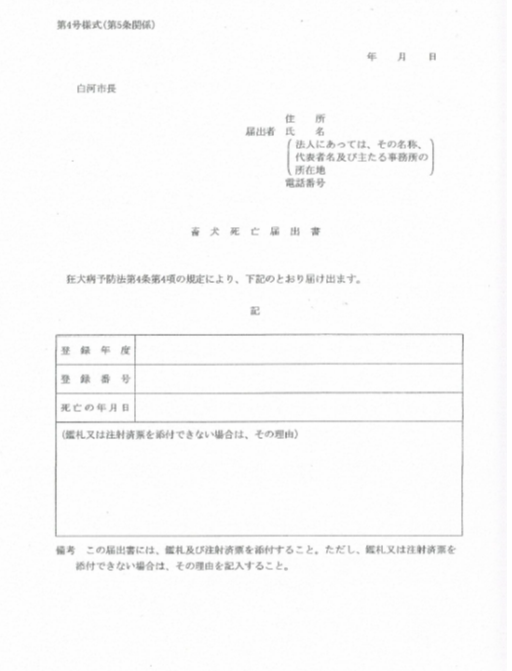 白河市役所 第4号(第5条関係)、「畜犬死亡届出書」