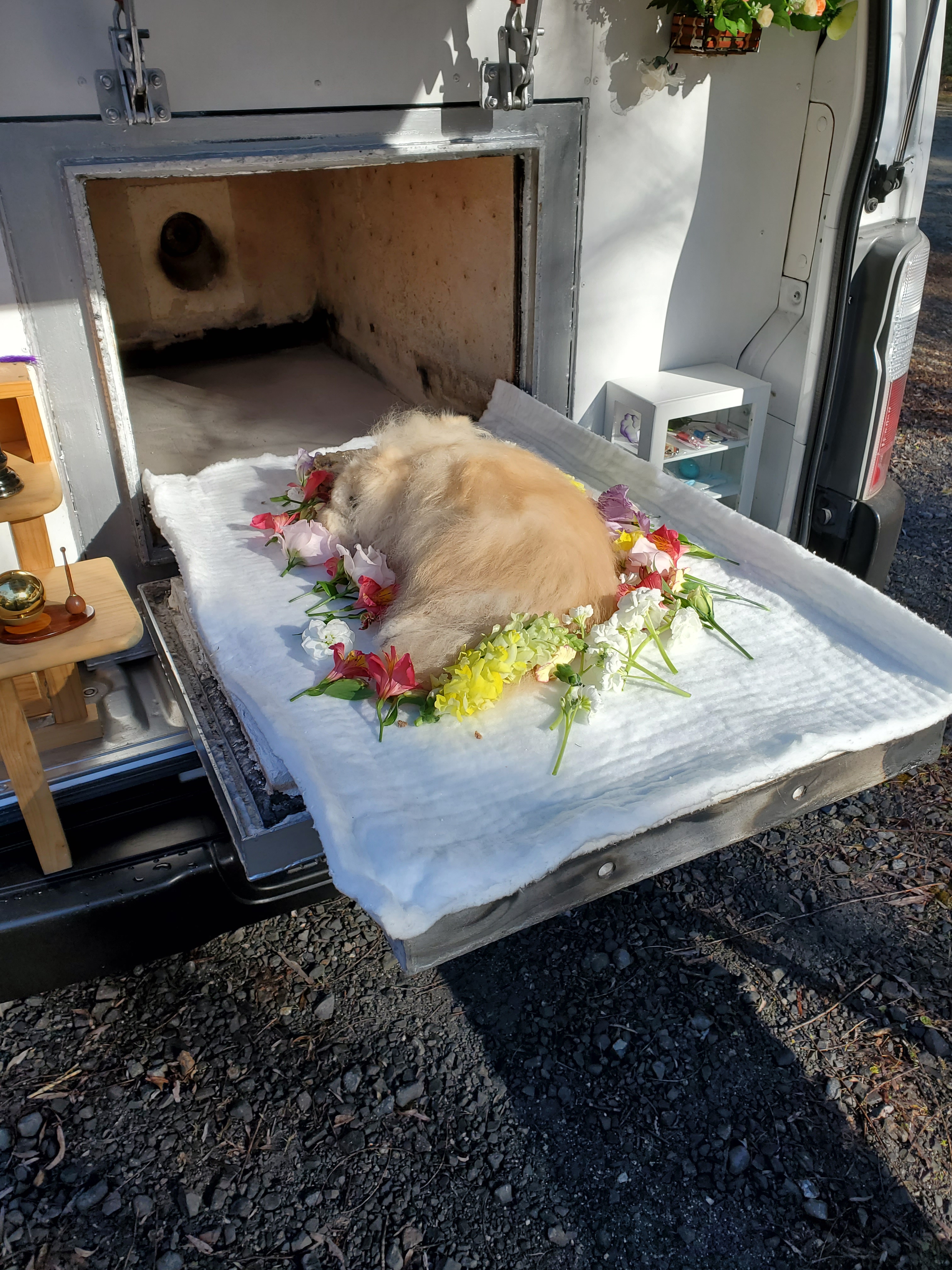 「チャッピー」が元気なってほしい!! なんとか治してあげたい!  埼玉県の病院まで連れて行きました。K様の思いが痛いほどわかります。火葬のお時間から、約1時間でご収骨が可能になり、可愛らしい、虹色の骨つぼにお入れいたしました。