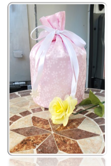お骨入れはピンクの巾着袋にお入れし、最後は奥様の手にシッカリと抱っこして頂きました。
