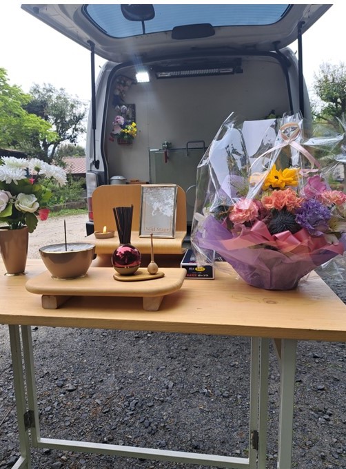 2024年4月27日 白河市 龍興寺、10時 4名に立会って頂きました。大好きだった鶏ささみ、キューリも一緒に。