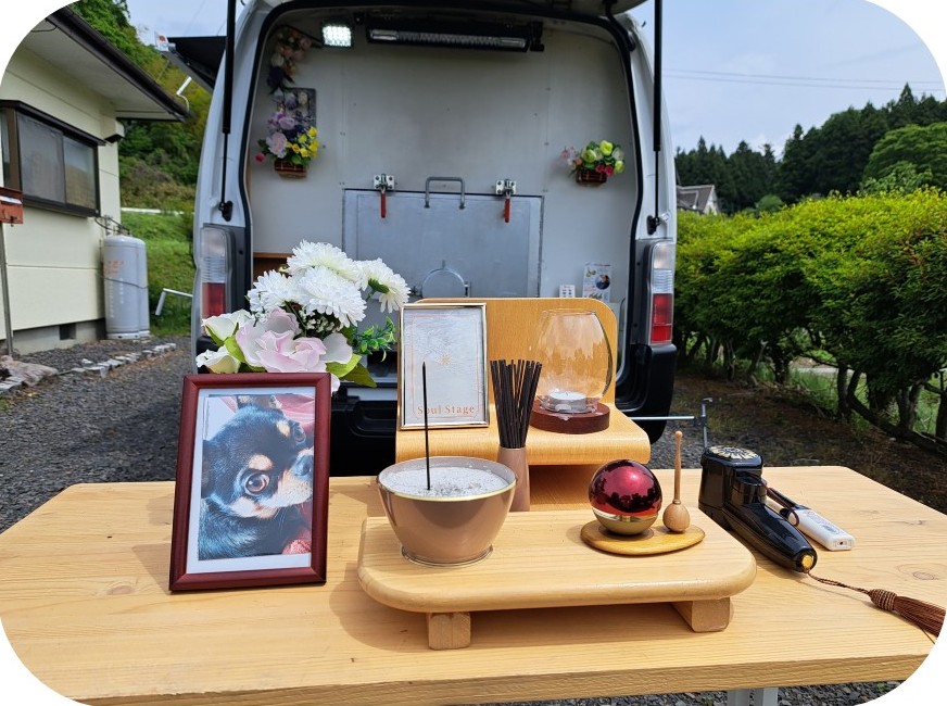 2025年5月22日10時、3名様に立ち会って頂きました。お焼香⇒たまゆらりんの奇麗な音色に送られ「いってらっしゃい💛」