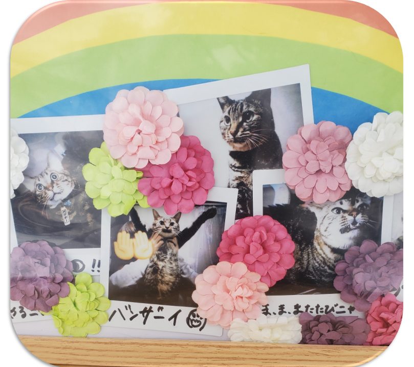 大好きだったチュールはもちろん! 他にも沢山お入れ頂きました。最期に手書きの文字「ありがとう」と書かれた言葉を添えて、天国へ旅立ちました。