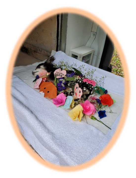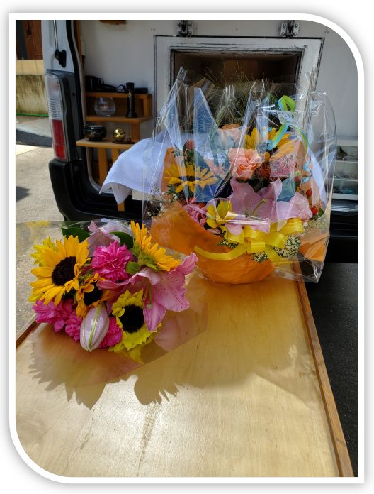最期のお別れのお言葉と「ありがとう」と書かれた白い布をかけて頂き天国へお送り致しました。
